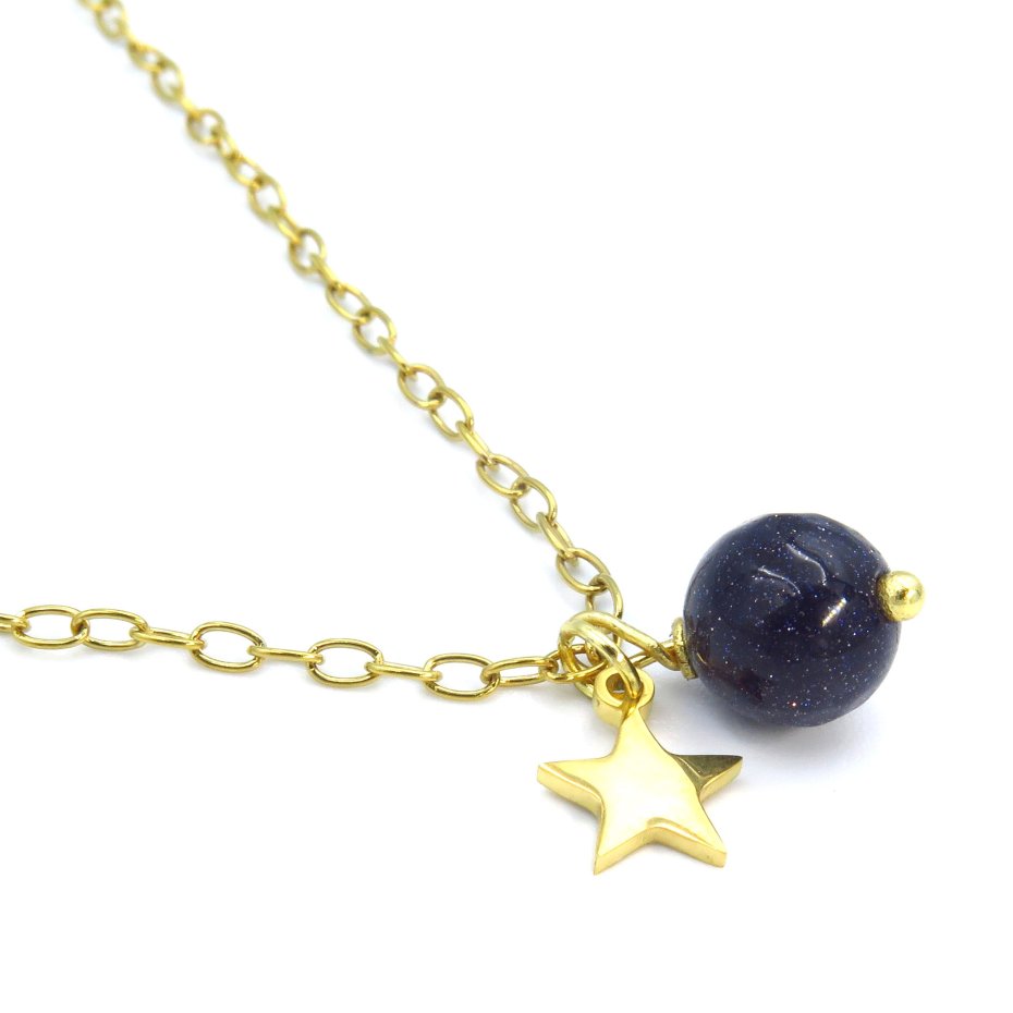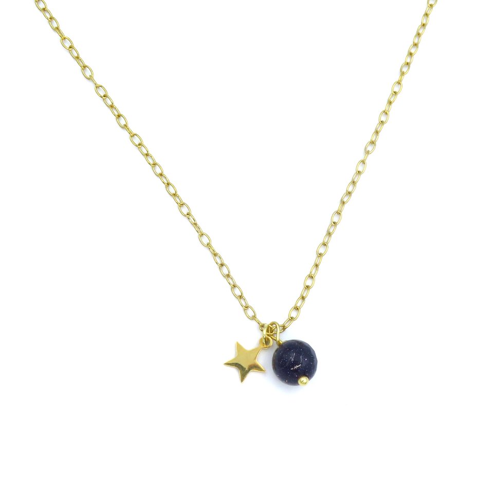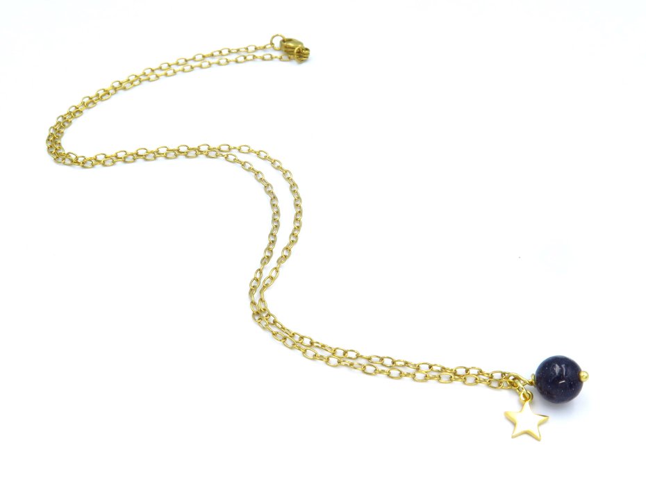 Subtelny naszyjnik MYSTICAL CAIRO z kuleczką granatowego kamienia Noc Kairu przepięknie migocze niczym afrykańskie, gwieździste niebo nocą. Ten kamień zawiera błyszczące drobinki, a wraz z gwiazdką w kolorze złotym pięknie ozdobi Twój dekolt i przyciągnie uwagę innych.
