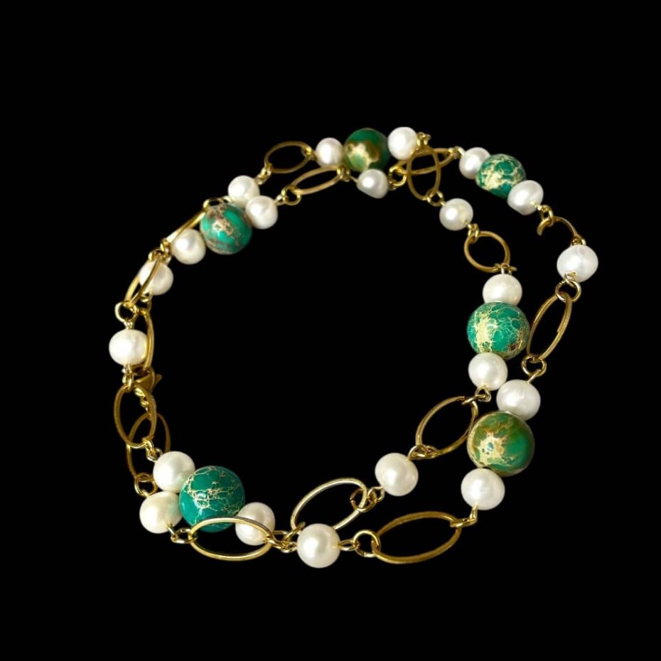 Naszyjnik z perłami i jaspisem cesarskim to połączenie elegancji z naturalnym wdziękiem. Delikatne perły przeplatają się z jaspisem cesarskim, tworząc harmonijną i spójną całość. Owalne ogniwa dodają biżuterii lekkości oraz nowoczesnego charakteru, podkreślając jej subtelny styl. To idealny dodatek do klasycznych stylizacji, wnoszący odrobinę organicznego uroku i ponadczasowej klasy.