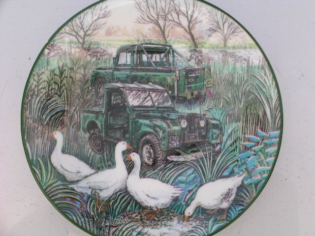 Porcelanowy talerzyk z zabawnej serii samochodowej Careful Owners (autor Alex Williams) - kadry porzuconych i zapomnianych samochodów, którymi czule opiekuje się już tylko... natura :) Tutaj odsłona z Land Roverami. Błyszcząca, jedwabista malatura. Sygnowany Hudson Middleton. Góra12; dół 6; wys. 1,5 cm. Stan zachowania bardzo dobry minus drobna wada fabryczna w postaci podszkliwnego pieprza.