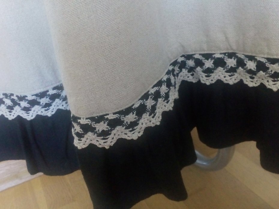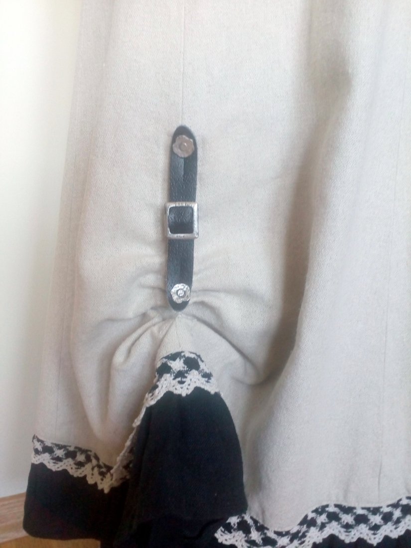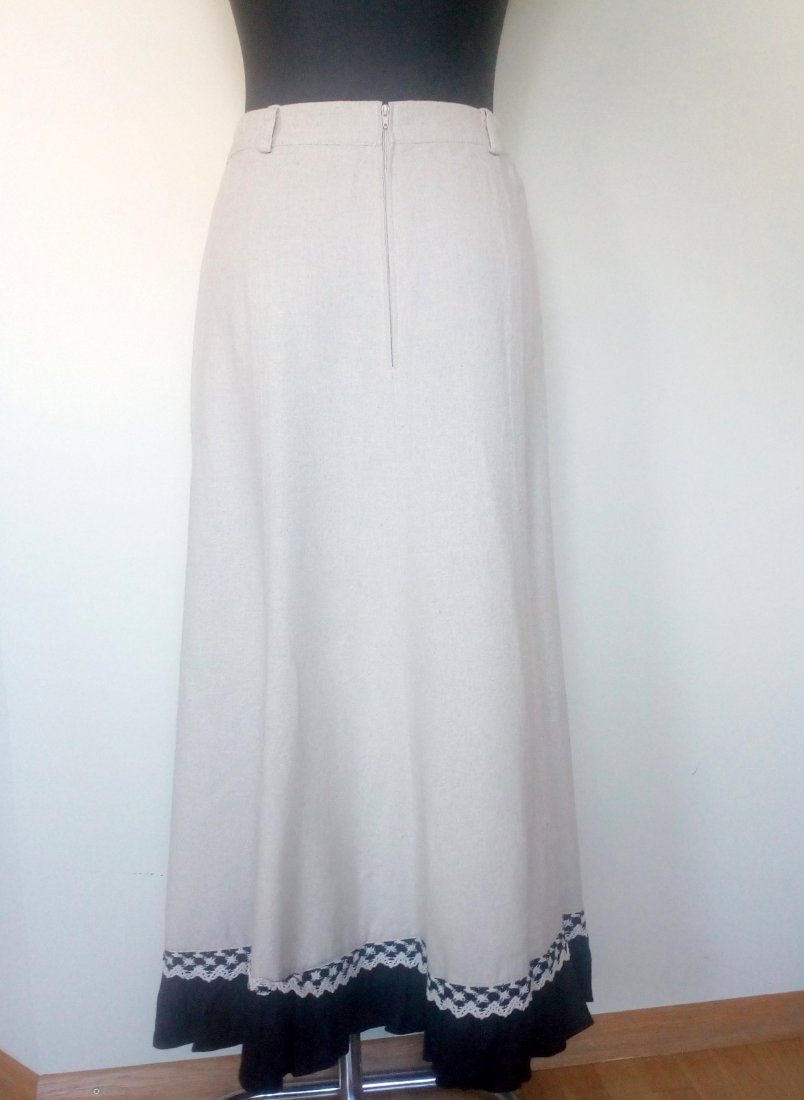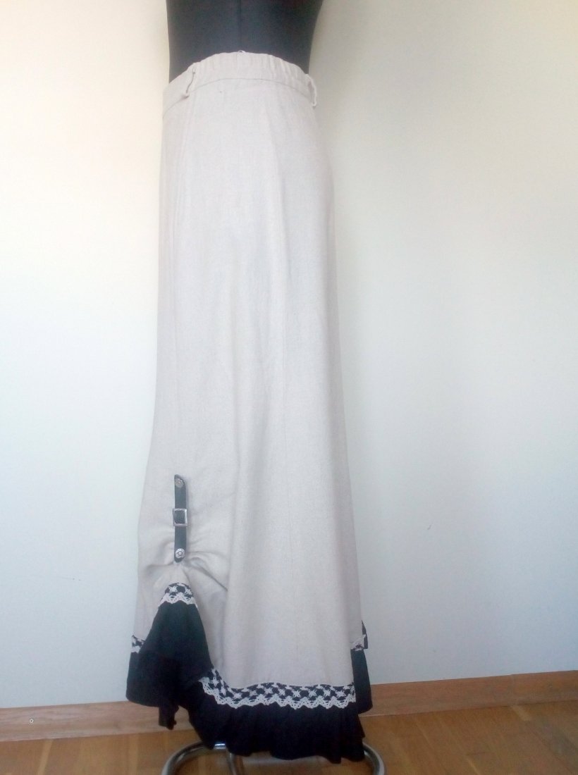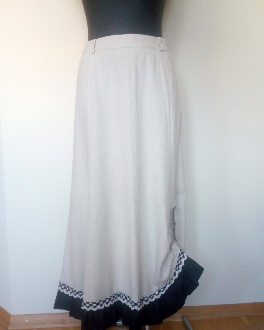 Piękna spódnica maxi, z lnu w naturalnym beżowym kolorze, u góry usztywniany pasek ze szlufkami i z wszytą gumą po bokach, zapinana w tyle na zamek, uszyta z klinów, u dołu czarna, lniana falbana i bawełniana koronka w beżowo-czarnym kolorze, u dołu lewego boku podpinana skórzanym paskiem w czarnym kolorze z niedużą, metalową klamrą, pasek dopinany na metalowych guzikach, całość bez podszewki