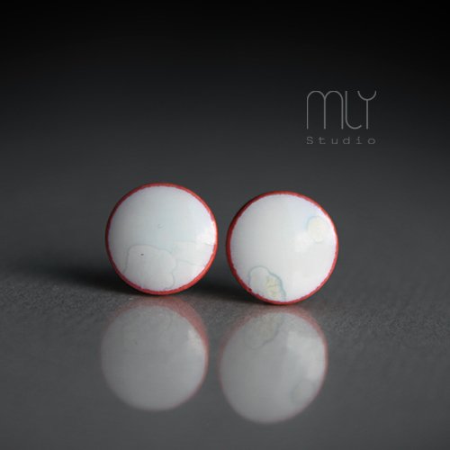 Ceramiczne lekko nieregularne kolczyki w formie sztyftów, ręcznie wykonane z delikatnej porcelany, barwionej na koralową czerwień jednostronnie szkliwione białym szkliwem z efektem drobnych plamek, na antyalergicznych sztyftach w kolorze srebrnym.Średnica ok. 11mm. Polecam