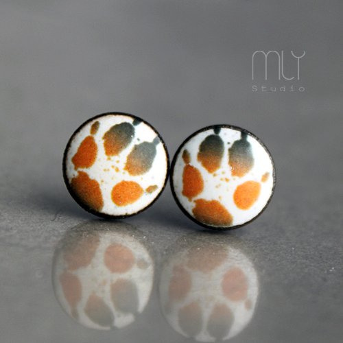Ceramiczne okrągłe kolczyki, ręcznie wykonane z delikatnej gliny kamionkowej, jednostronnie szkliwione mieszanką białokremowych szkliw z efektem plamek, dekorowane kalką ceramiczną w kolorze szarym i pomarańczowym,na antyalergicznych sztyftach. Średnica ok. 11mm. Polecam