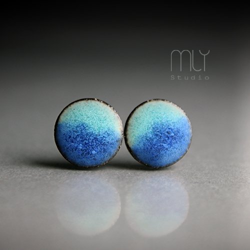 Ceramiczne lekko nieregularne kolczyki w formie sztyftów, ręcznie wykonane z delikatnej gliny kamionkowej, jednostronnie szkliwione kobaltowo błękitnym matowym szkliwem z efektem drobnych plamek i krystalizacji, na antyalergicznych sztyftach w kolorze srebrnym.Średnica ok. 11mm. Polecam