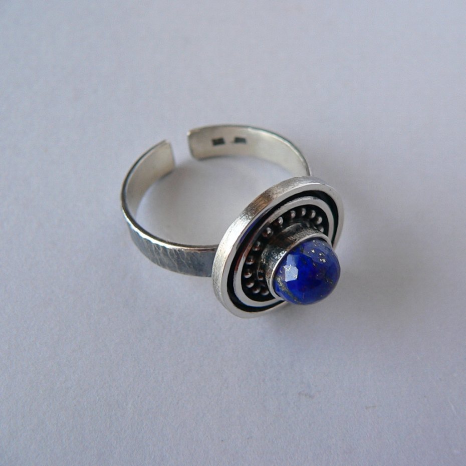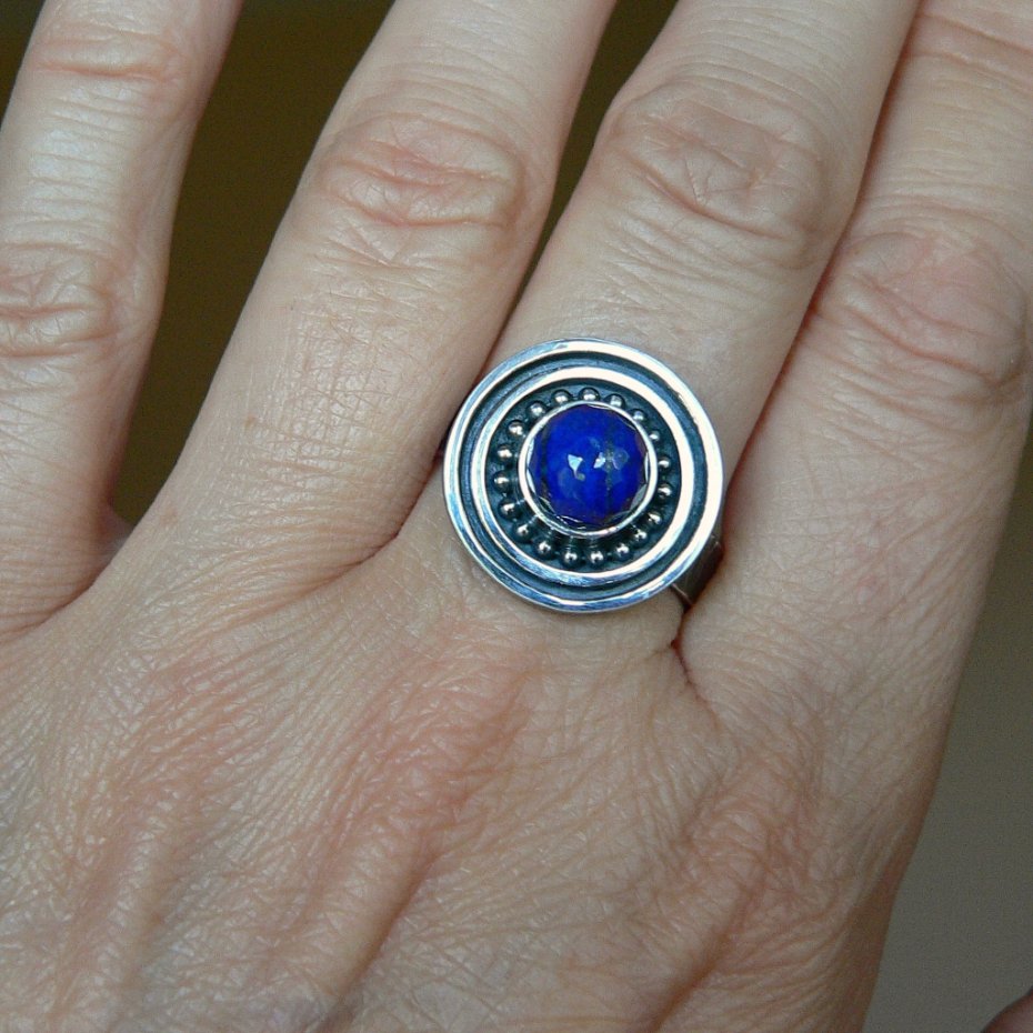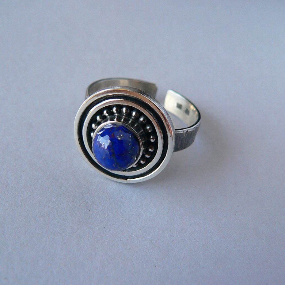 Pierścionek wykonany ze srebra , sercem pierścionka jest naturalny, fasetowany lapis lazuli / klasa AA, z żyłkami pirytu/w efektownej, oksydowanej i mocno polerowanej oprawie . Średnica kamienia 8 mm, średnica frontu 19 mm Obrączka regulowana /do rozmiaru 20/, przy zakupie proszę o podanie noszonego rozmiaru, ustawię obrączkę.