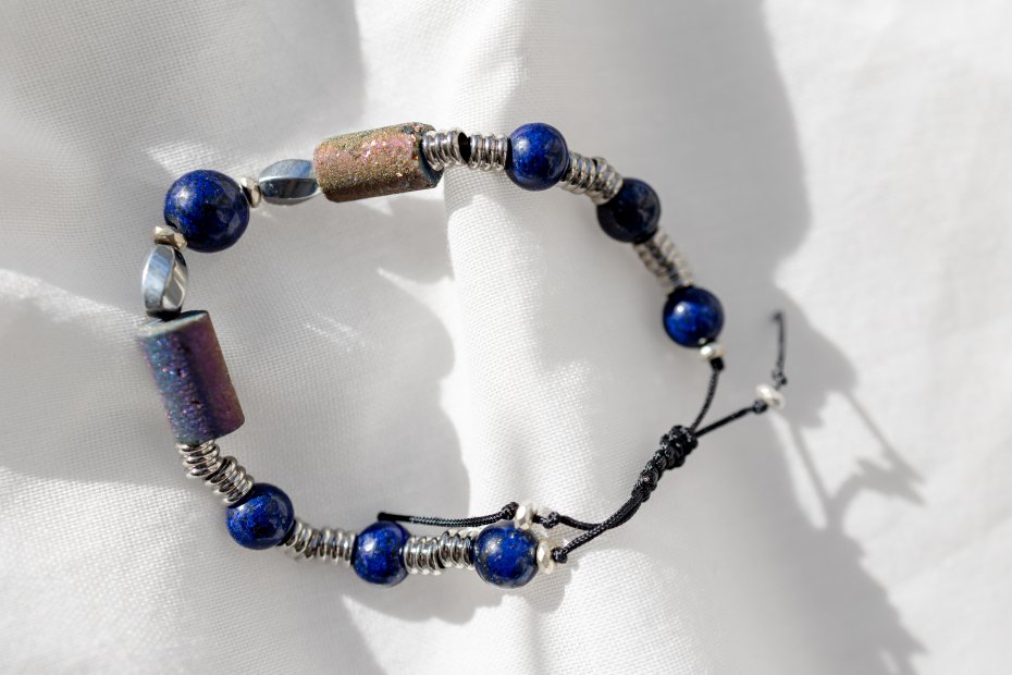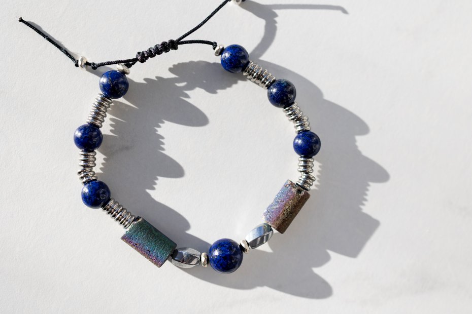 Charakterystyczna bransoletka ‘Magic Blue’ w kolorze niebieskim oraz fioletowym z naturalnych kamieni na czarnym regulowanym sznurku (pasuje na nadgarstek od 16 cm). Jako element centralny – gładka kulka lapis lazuli w otoczeniu hematytu w kolorze srebrnym oraz walców agatu tytanowego o tęczowym połysku. Dopełniają kompozycję elementy ze stali chirurgicznej w kolorze srebrnym.