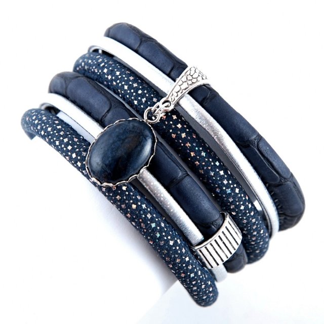 Elegancka bransoletka podwójnie zwijana wokół nadgarstka, wykonana z rzemieni w kolorach granatowym i srebrnym.