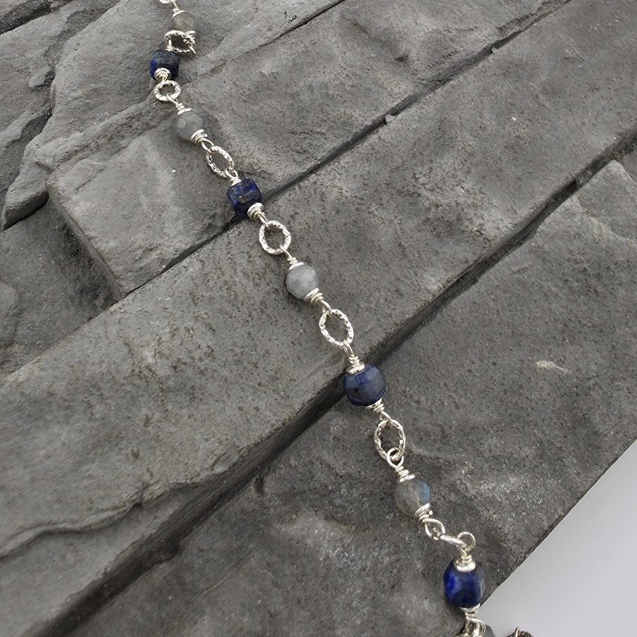 Minimalistyczna i kobieca bransoletka na co dzień. Wykonana w całości ze srebra próby 925 oraz fasetowanych kostek lapisu lazuli i kulek labradorytu wielkości 5 mm. Całkowita długość bransoletki regulowana od 18,5 cm do 20,5 cm. Moge ją także zoksydować lub zrobic naszyjnik do kompletu. Ozdobnie zapakowana.