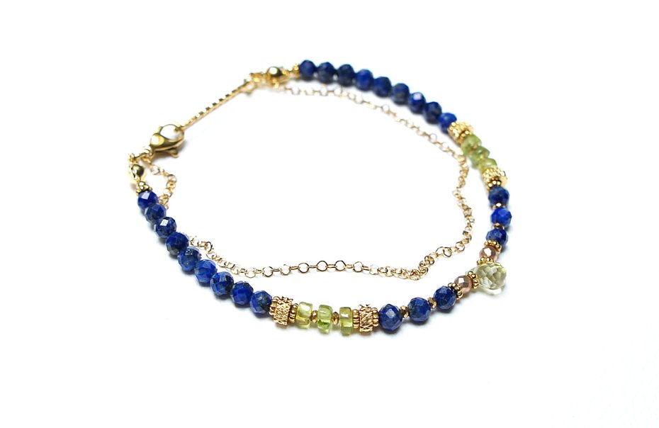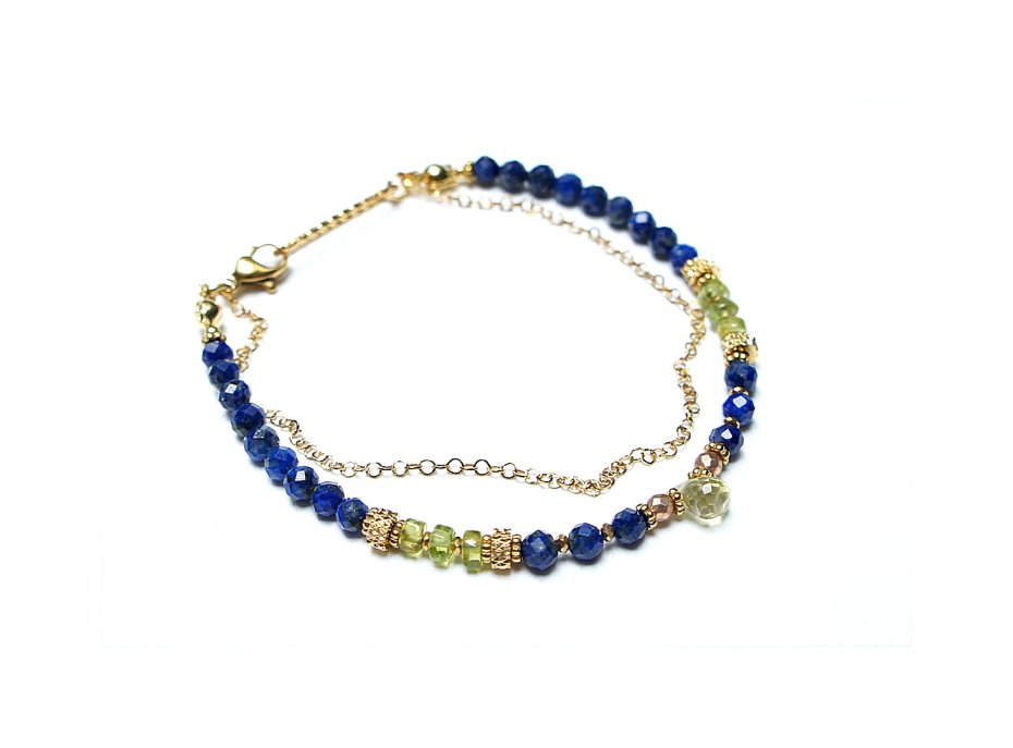 Delikatna bransoletka wykonana w całości ze stali szlachetnej pozłacanej oraz naturalnych kamieni - fasetowany lapis lazuli [4mm], fasetowany hematyt o matowej powłoce [2mm], nieregularne talarki peridotu [ok. 4 x 2mm], przekładek z hematytu [1mm] oraz brioletki fasetowanej kwarcu lemon. Całkowita długość bransoletki ok. 19,5cm. Na życzenie możemy dopasować bransoletkę do innego nadgarstka - w tej sprawie prosimy o wcześniejszy kontakt.