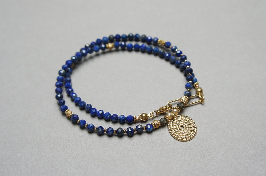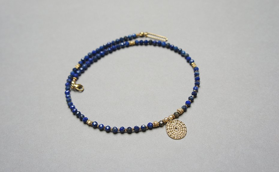Krótki, delikatny naszyjnik wykonany w całości ze stali szlachetnej pozłacanej oraz naturalnych kamieni - fasetowany lapis lazuli [4mm], fasetowany piryt o surowym wyglądzie [3,5mm], fasetowany, platerowany hematyt o matowej powłoce [ 3mm], przekładek z hematytu [3 x 2mm oraz 1mm]. Naszyjnik o długości ok. 42cm.