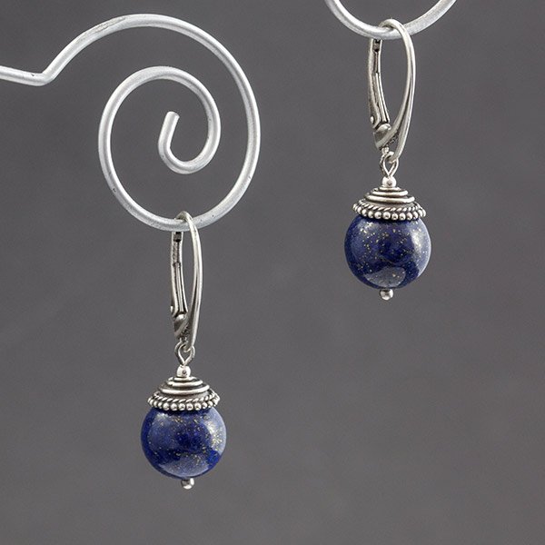 Kule lapisu lazuli (11mm) ubrane w ozdobne czapeczki bali. Całość zawieszona na biglach angielskich. Elementy wykończeniowe srebrne próba 925. Długość całkowita kolczyków 3,6 cm. Kolczyki są ozdobnie zapakowane.