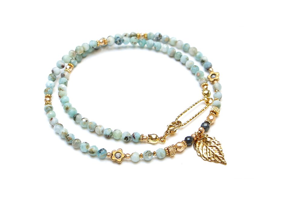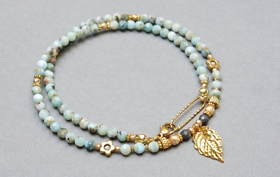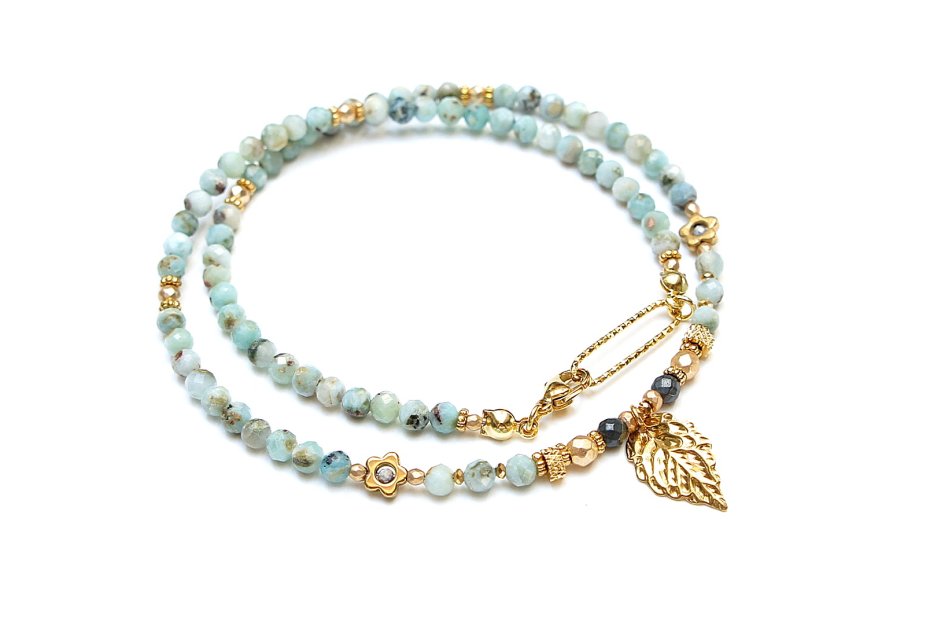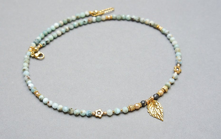 Krótki, delikatny naszyjnik wykonany w całości z pozłacanej stali szlachetnej, fasetowanego larimaru [4mm; rzadki minerał występujący tylko na Dominikanie], szafirów fasetowanych o błękitnym wybarwieniu [1,5mm], hematytu fasetowanego, platerowanego o matowej powłoce [4mm, 2mm i 3 x 2mm], przekładek z hematytu [1mm], kwiatków z hematytu [6mm]. Naszyjnik o długości ok. 42,5cm. Biżuteria ozdobnie zapakowana. Jedyny egzemplarz.