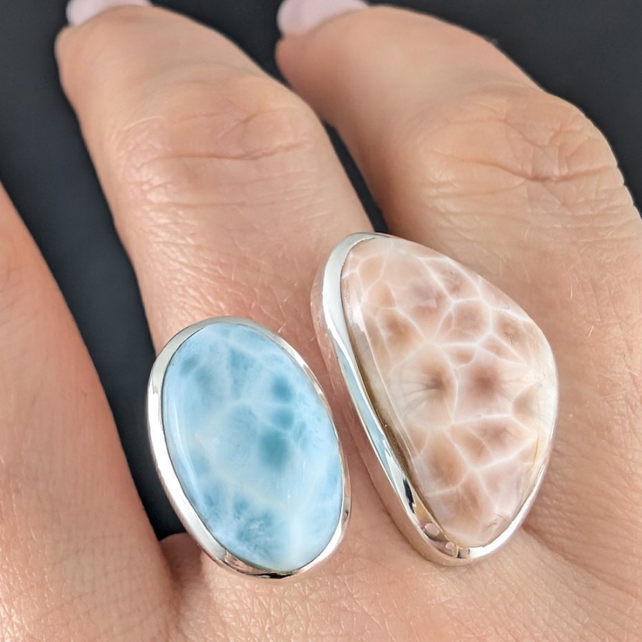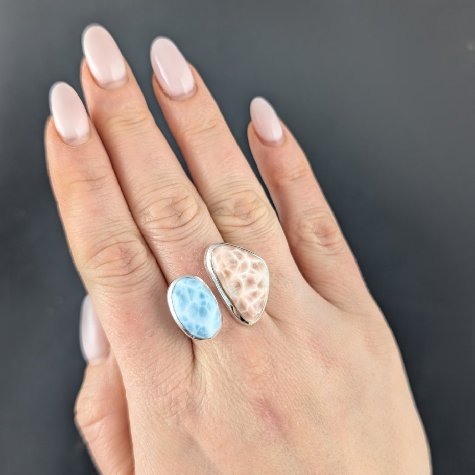 Pierścień z oprawionymi w srebro pr. 925 pięknymi okazami rzadkiego thomsonitu i larimaru. Ciekawe połączenie kamieni , bo wyglądają one bardzo podobnie pod względem naturalnego malunku, tylko w innych kolorach. Wymiary oprawy larimaru 18 x 12 mm, thomsonitu 23 x 16 mm. Waga 10,8 g. Rozmiar jubilerski 19, mogę powiększyć do max 22. Wykonany przez dostawcę kamieni. Pierścionek zostanie wysłany w ozdobnym pudełeczku.