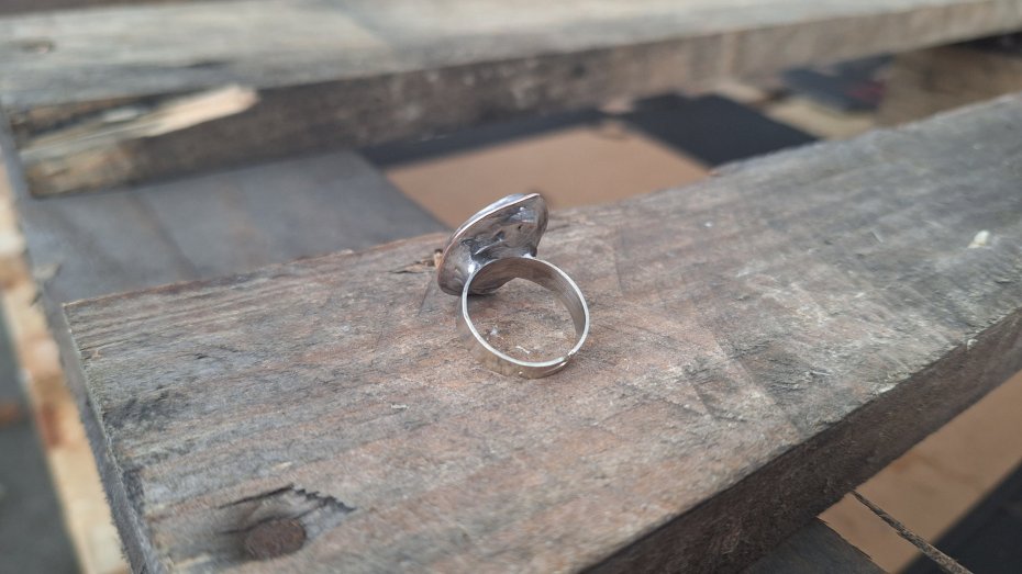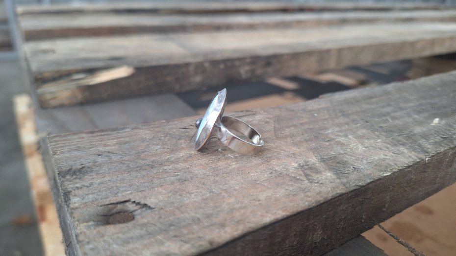 Pierścionek wykonany z miedzi, cyny i larimaru. Wymiary ok. 2.2 na 1.5 cm. Regulowany. Nie jest ciężki.