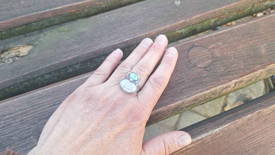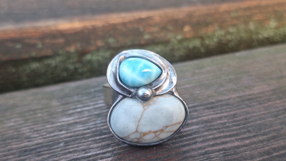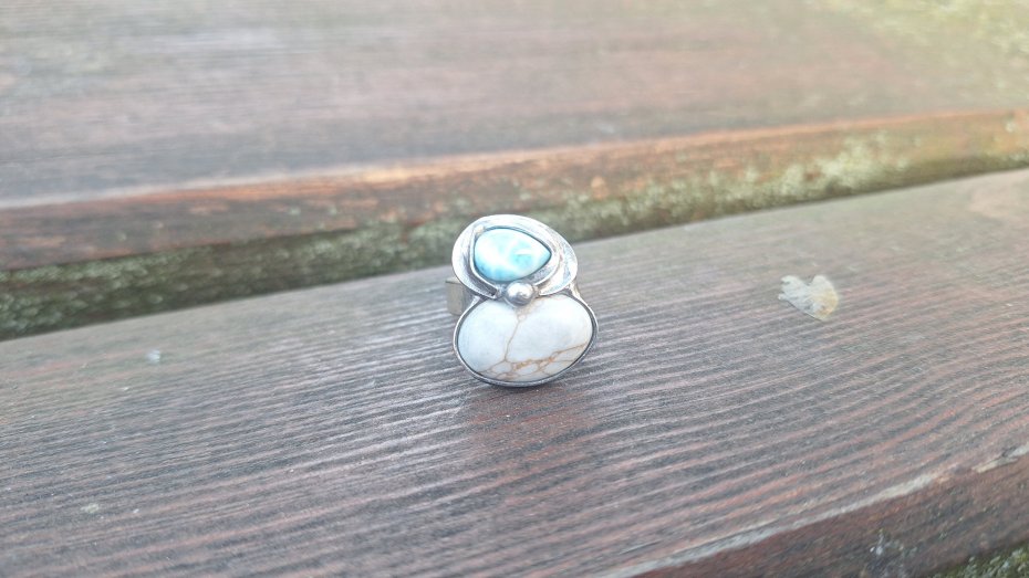 Pierścionek wykonany z miedzi, cyny, howlitu i larimaru. Wymiary ok. 2 na 1.8 cm. Regulowany. Nie jest ciężki.