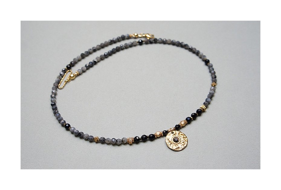 Krótki, delikatny naszyjnik wykonany w całości ze stali szlachetnej pozłacanej oraz naturalnych kamieni - fasetowany larvikit [3mm], onyks fasetowany [3,5mm], hematyt fasetowany, platerowany [4mm], przekładek z hematytu [3 x 2mm oraz 1mm] oraz zawieszki z kryształkiem Swarovski. Naszyjnik o długości ok. 44,5cm. Biżuteria ozdobnie zapakowana.