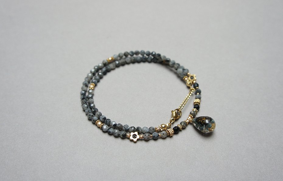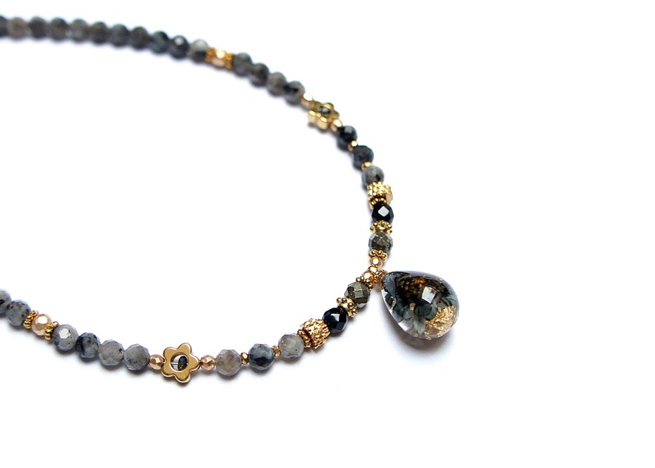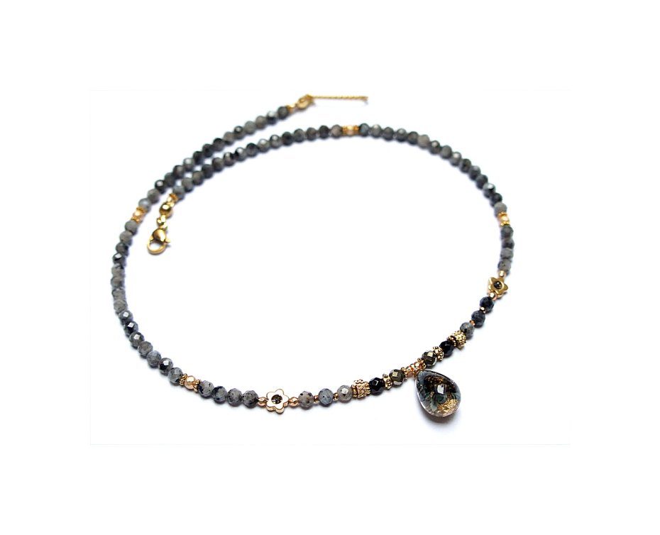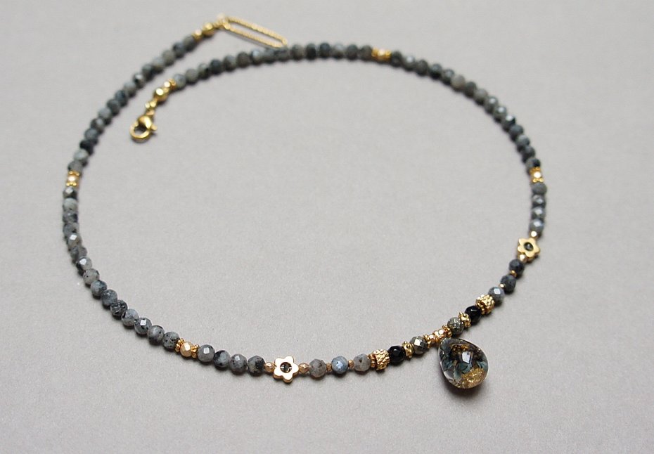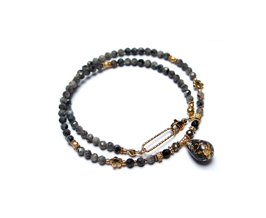 Krótki, delikatny naszyjnik wykonany w całości ze stali szlachetnej pozłacanej oraz naturalnych kamieni - fasetowany larvikit [3,5mm], onyks fasetowany [3mm], hematyt fasetowany, platerowany [3mm i 2mm], przekładek z hematytu [1mm oraz 6mm - kwiatki] oraz zawieszki z lampworku z zatopionymi płatkami złota. Naszyjnik o długości ok. 41cm. Biżuteria ozdobnie zapakowana.