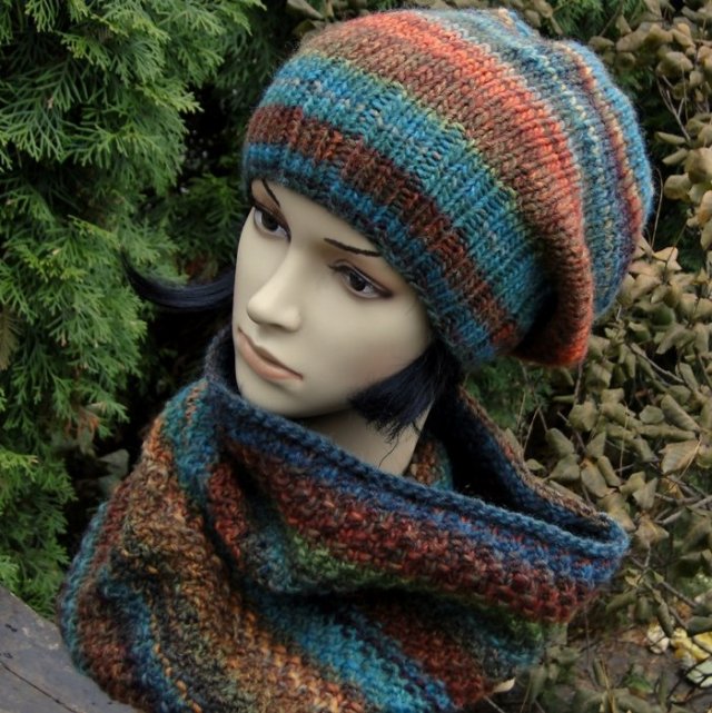 Ciepły, mięsisty ( wykonany niezbyt luźno, aby nie hulał po nim wiatr :) ) i przyjemny w dotyku komplet wykonany ręcznie na drutach z rewelacyjnej włóczki prod. hiszpańskiej ( 50% wool, 50% akryl), w pięknych kolorach. Czapka jest dwustronna i bezszwowa. Rozmiar czapki : obwód od 55-57 cm, wysokość ok. 29 cm, komin: obwód ok. 66 cm, wys. ok. 35 cm. Bardzo twarzowy. Polecam serdecznie.