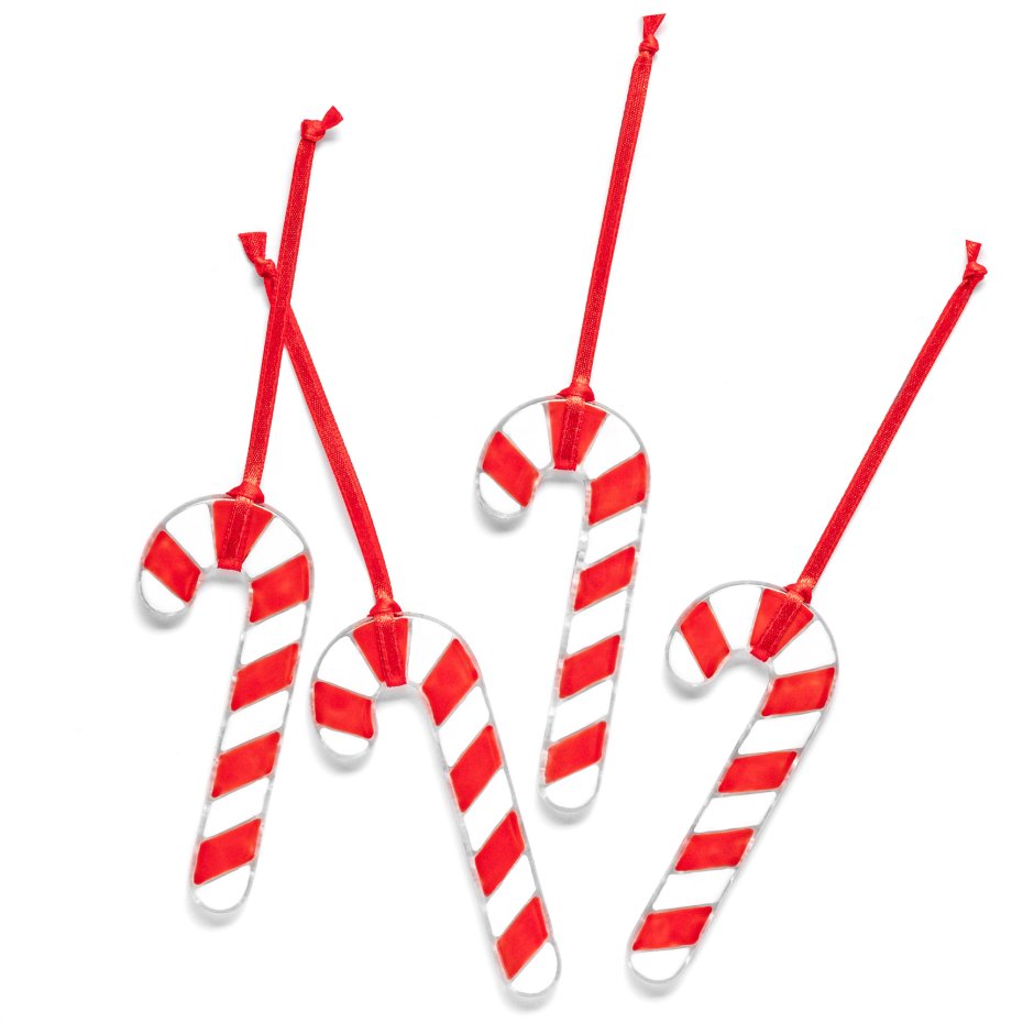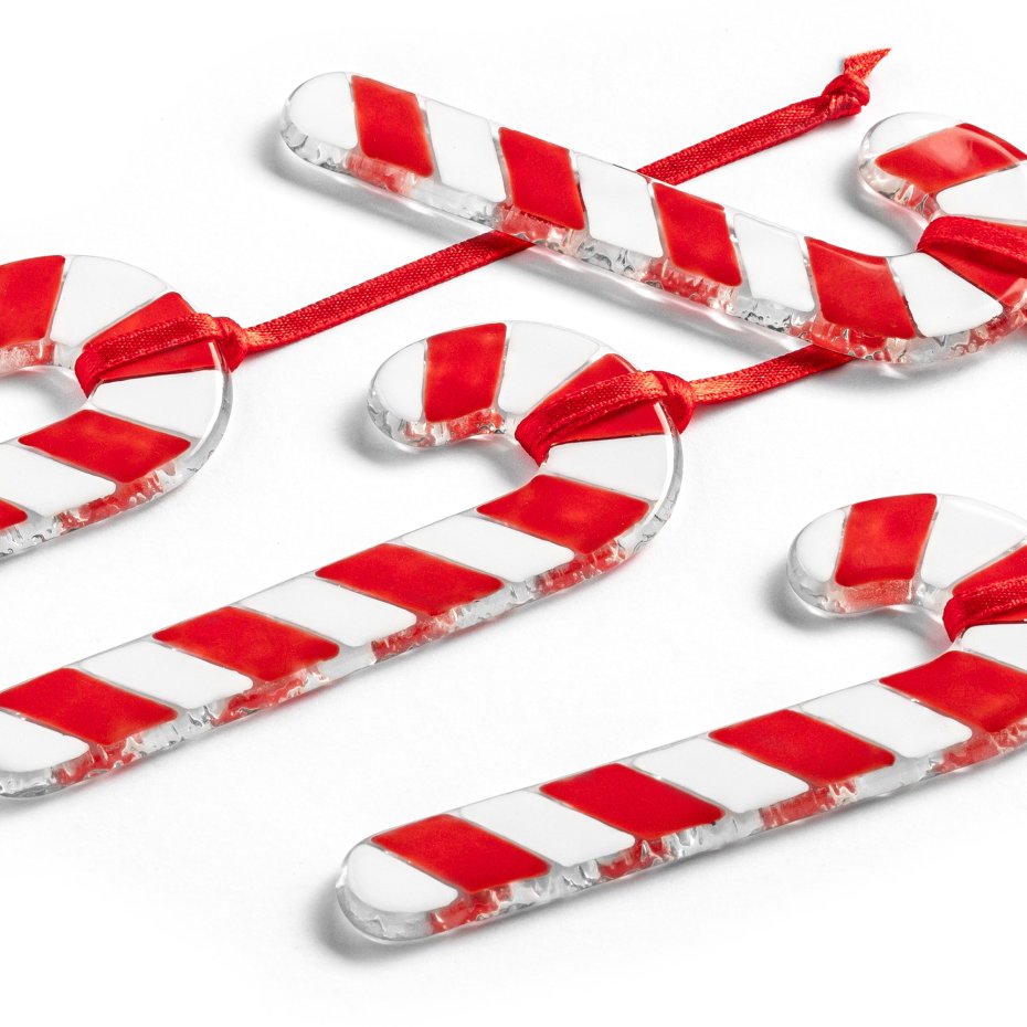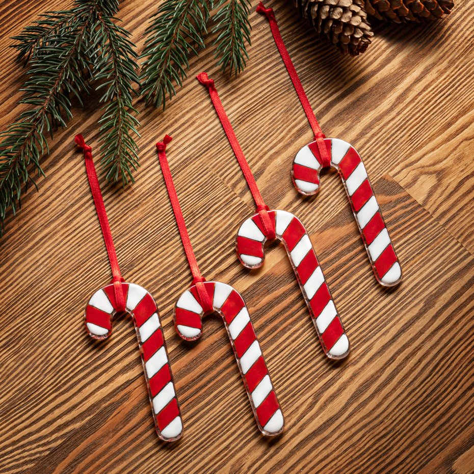 Zestaw czterech autorskich świątecznych zawieszek na choinkę wykonanych ze szkła metodą fusingu. Elementy wykonane ze szkła bezbarwnego z ręcznie malowanym i wypalanym wzorem na powierzchni. Spód szkła posiada delikatną fakturę ciekawie odbijającą światło.