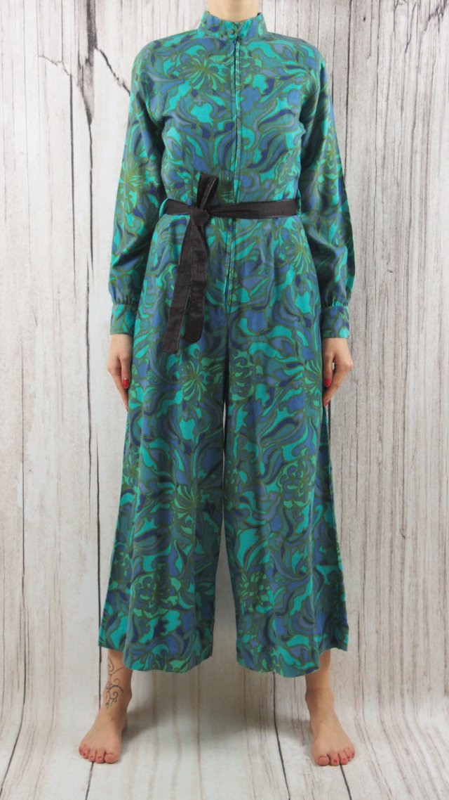Przepiękny kombinezon vintage. Ekskluzywnej marki VIYELLA. Z bawełny 45%, wełna 55%. W pasie szlufki - można przewiązać na przykład szarfą jak ja to zrobiłam, lub włożyć wąski pasek. Piękny krój.