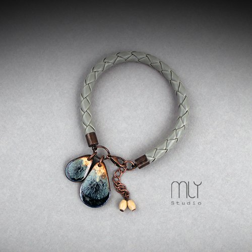 Efektowna bransoletka wykonana z rzemienia jubilerskiego, elementów w kolorze miedzi i ręcznie wykonanych ceramicznych zawieszek, szkliwionej błyszczącym szaro brunatnym szkliwem, Obwód regulowany, długość elementu ceramicznego ok 2,6cm i 1,8. Polecam . Termin realizacji zamówienia to 1-2 dni.