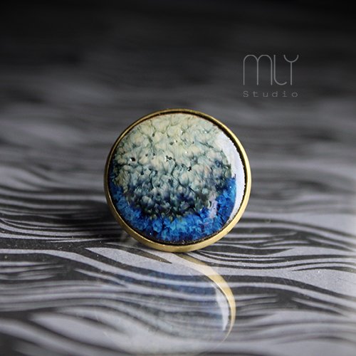 Efektowny pierścień z ceramicznym oczkiem, ręcznie wykonanym z gliny kamionkowej, poszkliwionym mieszanką szarobłękitnych szkliw z efektem plamek.Obrączka regulowana w kolorze starego złota, średnica oczka ok 23mm. Polecam