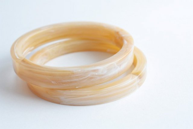 Zestaw dwóch beżowych bransoletek o niejednolitym, rozbielonym odcieniu. Wykonane z wysokiej jakości lekkiego tworzywa przypominającego w wizualnie marmur w kolorze kawy z mlekiem.