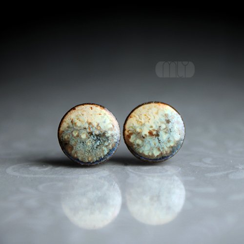Ceramiczne kolczyki w formie sztyftów, ręcznie wykonane z delikatnej czekoladowobrązowej gliny kamionkowej, jednostronnie szkliwione efektownym granatowo brunatnym szkliwem z efektem plamek, na antyalergicznych sztyftach w kolorze srebrnym.Średnica ok. 9mm. Polecam