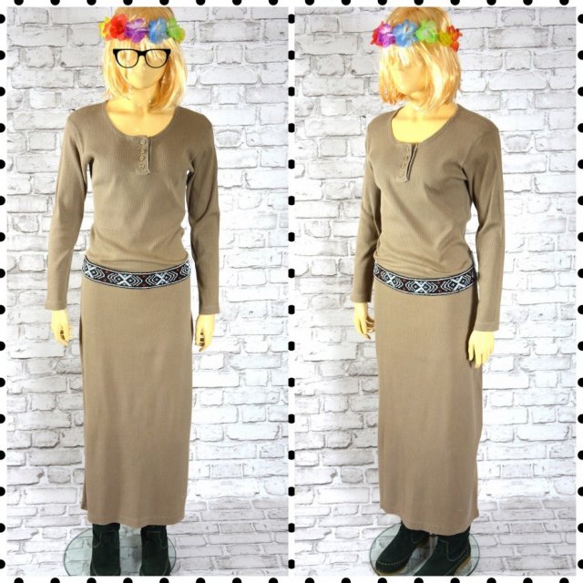 Długa sukienka w kolorze latte o dopasowanym ,poszerzanym kroju, sukienka wykonana z prążkowanej wysokiej jakości bawełny (troszkę grubszej). Przy linii dekoltu zapinana na guziczki. Idealna do noszenia zarówno z paskiem jak i bez. Sukienka jest elastyczna.