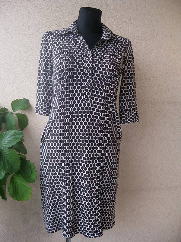 Piękna sukienka marki Laundry by design. Materiał 96% poliester, 4% spandex, miękki i lejący, pięknie się układa. Bez podszewki, kieszonki do wewnątrz, z przodu i z tyłu ozdobne szczypanki. Niewielkie ślady użytkowania.