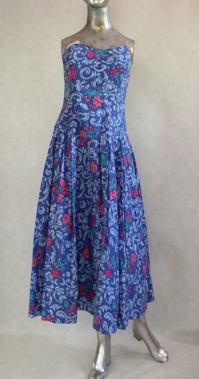 Sukienka firmy laura ashley.Rozmiar 40.Materiał bawełna.Tył zapinany na zamek+trzy guziczki.Odcięta poniżej pasa.Góra z podwójnie złożonego materiału,usztywniona.Bez ramiączek.Dół marszczony zakładkami.Z tyłu doszyta baskinka+dwa paski do wiązania.Stan bardzo dobry.Długość mierzona od pachy 106 cm.pod pachami 88 cm.pas 78 cm.