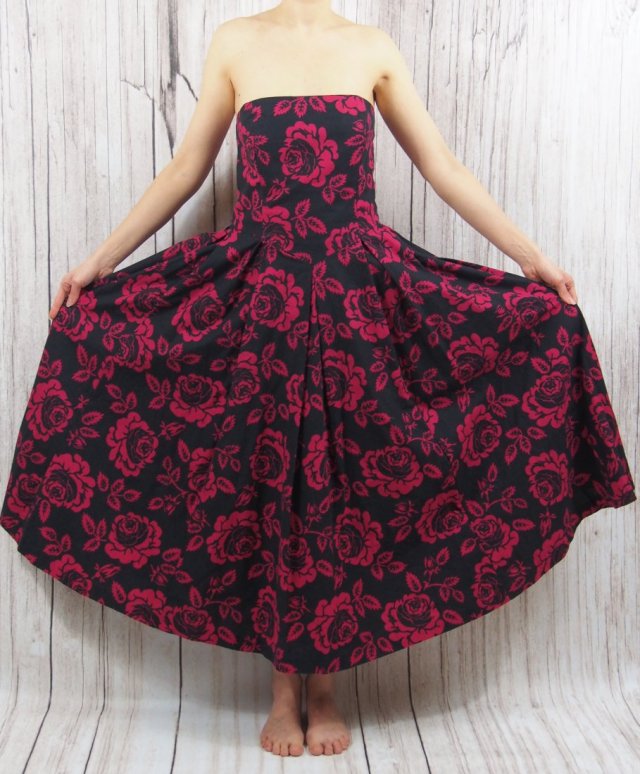 Przepiękna sukienka pin-upowa proj. Laury Ashley. Dolna część rozkloszowana, z 3/4 koła, dodatkowo można ją wzmocnić halką co da jeszcze piękniejszy efekt. Góra gorsetowa, usztywniona w kilku miejscach fiszbinami. 100% bawełna.