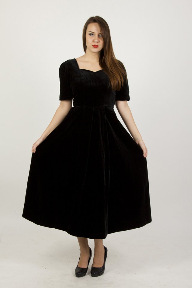 Wyjątkowa, welurowa, stylizowana na lata 40 elegancka, czarna sukienka z pięknym dekoltem w kształcie serca - idealnym dla kobiet o dość krótkiej szyi. Mocno zaakcentowana talia, lekko podniesione ramiona, na plecach ładne wycięcie. Zapinana na zamek z boku i z tyłu do talii na powleczone guziki. Posiada podszewkę u góry, dół bez podszewki. Materiał dość ciężki i sztywny, ale bardzo dobrze się układa. Marka: Laura Ashley.