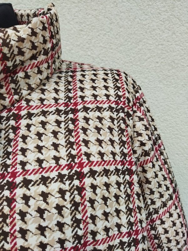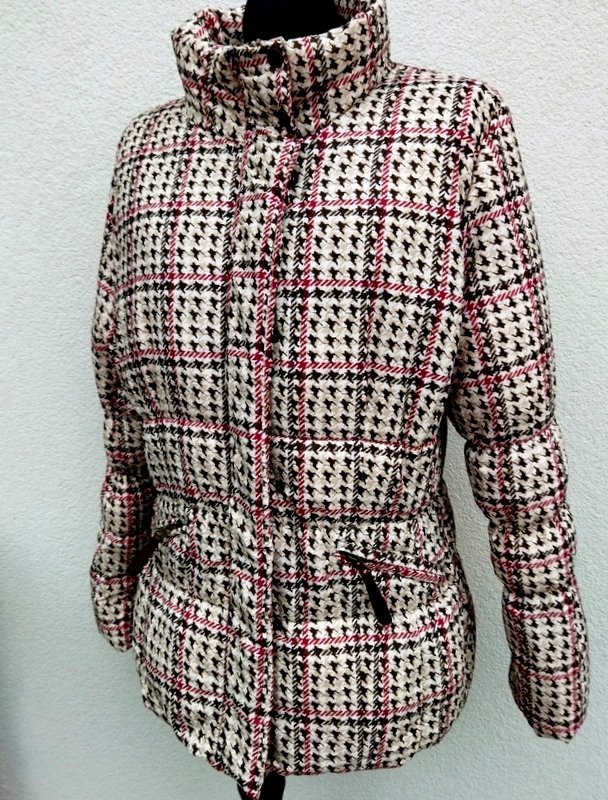 Miła, bardzo lekka kurtka z wzorzystej poliestrowej tkaniny z domieszką w kolorystyce beżu, brązu i winnej czerwieni, ze sztucznym ociepleniem , przeszywana gumonitkami . Z kołnierzem typu wyższa stójka , z dwiema wpuszczanymi kieszeniami z zamkami. Zapinana na zamek i ukryty pod listwą zapinaną na napy . Całość na podszewce