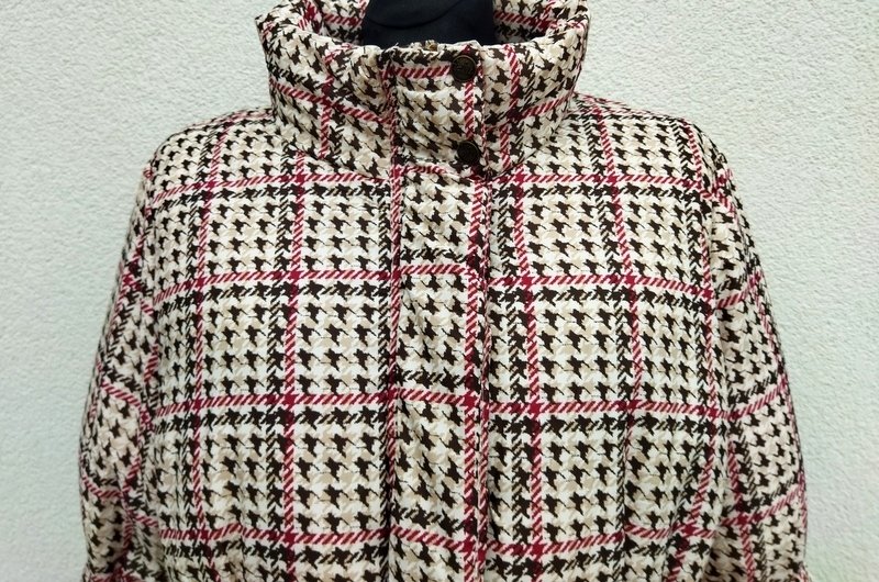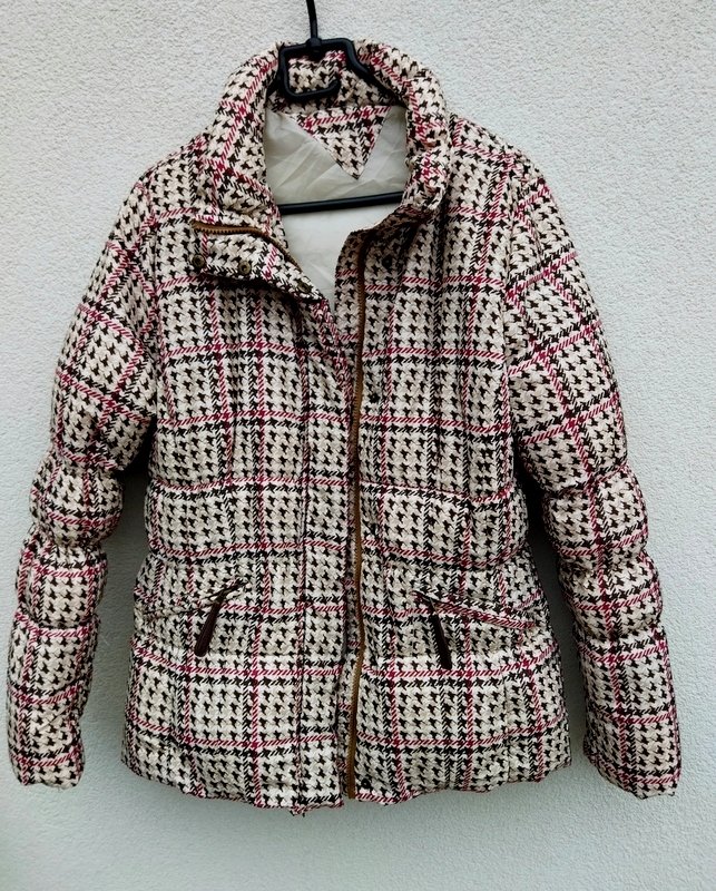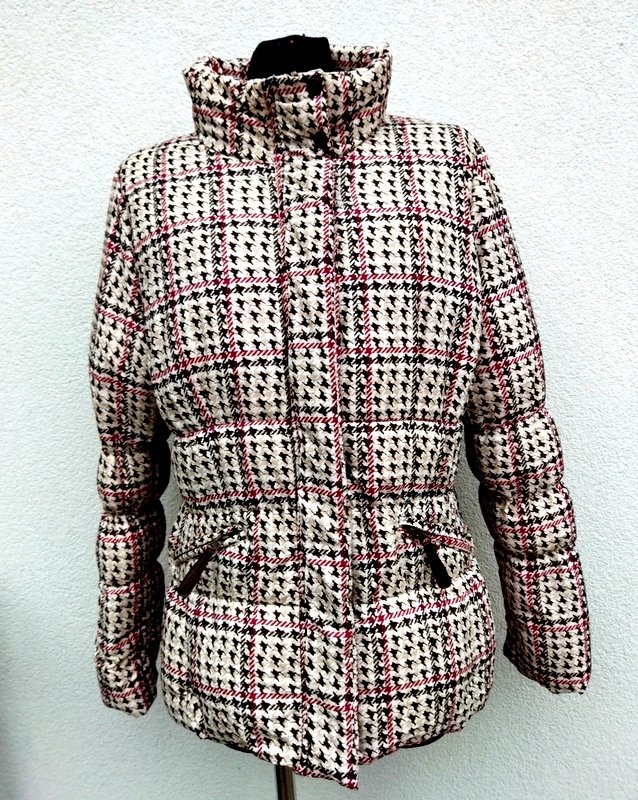 Miła, bardzo lekka kurtka z wzorzystej poliestrowej tkaniny z domieszką w kolorystyce beżu, brązu i winnej czerwieni, ze sztucznym ociepleniem , przeszywana gumonitkami . Z kołnierzem typu wyższa stójka , z dwiema wpuszczanymi kieszeniami z zamkami. Zapinana na zamek i ukryty pod listwą zapinaną na napy . Całość na podszewce