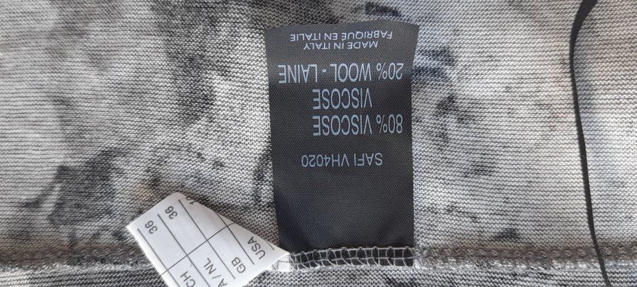 Cienka,aksamitna w dotyku materia, viscoza z dodatkiem wełny ,80/20, rozmiar z metki S, w realu uniwersalny, stan idealny