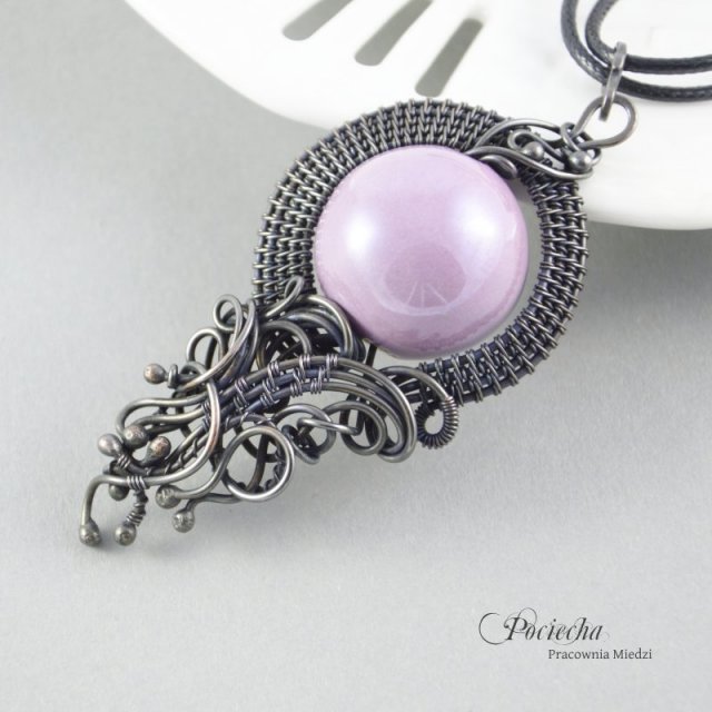 Naszyjnik z okazałym wisiorem. Od podstaw stworzony ręcznie z miedzi. Centrum wisiora stanowi duża ceramiczna kula o pięknym kolorze. Została ona opleciona misternie miedzią. Wisior zawiesiłam na podwójnym sznurze jubilerskim zaopatrzonym w zapięcie ręcznie robione kute. Obwód wynosi ok. 56 cm. Wisior wraz z krawatką ma wymiary 9,8 x 4,2 cm. Miedź patynowana na czarnyor i polerowana. Kula ma średnicę ok. 2,6 cm. Projekt autorskie polecam.