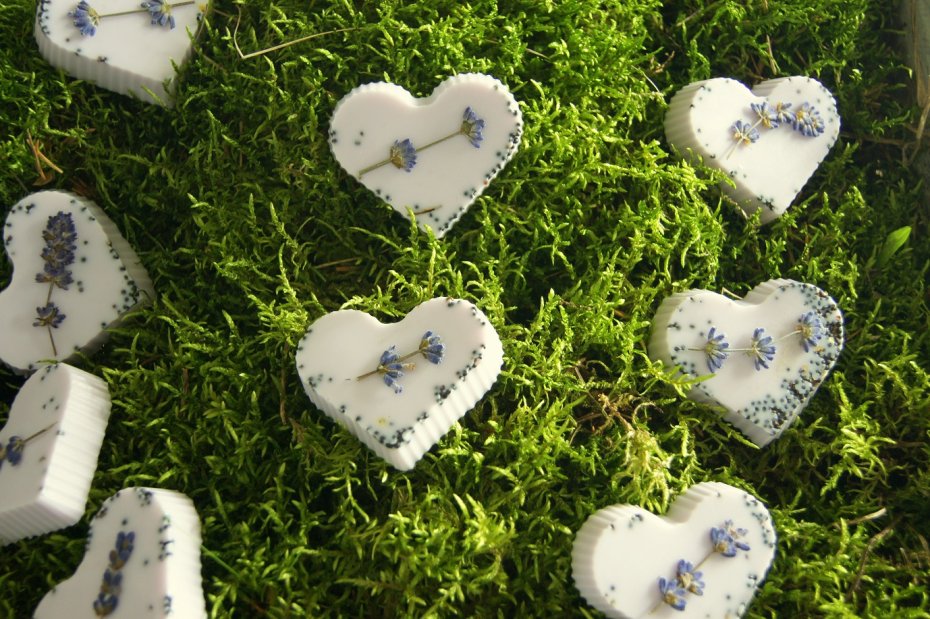 1) Mydło które powstaje na naszym lawendowym polu na Mazurach. Ręcznie robione serca lawendowe w kolorze fioletowym, ozdobione delikatnie zatopioną gałązką lawendy z naszego pola,w kształcie serduszek, z dodatkiem masła shea, wysokiej jakości olejku lawendowego oraz delikatnie masującymi kuleczkami rzepaku. Wymiary pojedynczego serduszka to 25 g ( +/-5g) , wysokość 1 cm, szerokość 6 cm. Każde jest osobno zapakowane,co zapobiega utracie wilgoci.