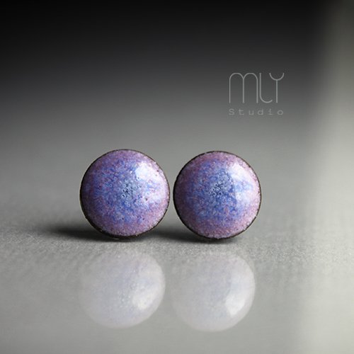 Ceramiczne okrągłe kolczyki, ręcznie wykonane z delikatnej gliny kamionkowej, jednostronnie szkliwione mieszanką fioletowych szkliw z efektem plamek, na antyalergicznych sztyftach w kolorze srebrnym. Średnica ok. 11mm. Polecam