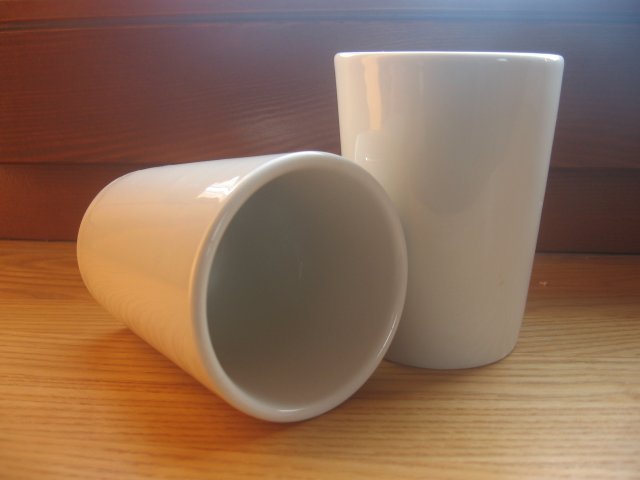 Dwa kubki porcelanowe w kolorze ecru, sygnowane. Prostota formy i elegancja w jednym. Stan zachowania bardzo dobry. Wymiary - wys. 9, 5 cm, śr. góry 7 cm, dołu 5, 3 cm