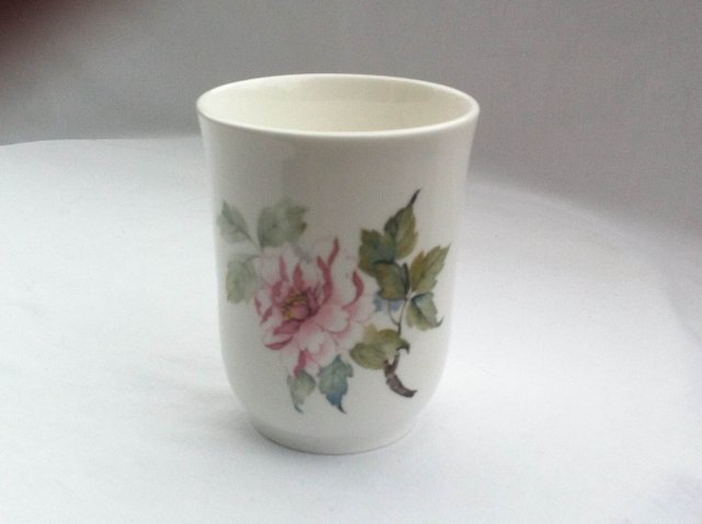 Kubek porcelanowy, łazienkowy, sygnowany ogólnie po angielsku, ale powtarzający znany wzór łazienkowo-kwiatowy / jak Hadida / . Przyjemna forma, jakość wykonania i błyszczące szkliwienie. Wygodny. Dół 5; góra 8; wys.10 cm. Stan zachowania bardzo dobry minus - na dnie wada szkliwienia.