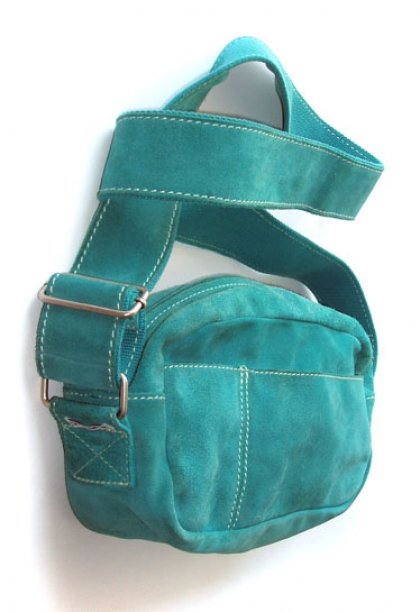 Torebka średniego formatu z turkusowo-lazurowego zamszu. Wewnątrz podszewka oraz kieszonka na rzep. Na zewnątrz również kieszeń. Ma długi pasek, więc można nosić na krzyz, na ramię, jak kto woli. Szer. 29 cm, wys. 15 cm, bok i dno szer. 10 cm; pasek max dł. 120 cm. Zamykana na suwak. Stan torebki dobry, jednak wymaga czyszczenia, posiada zabrudzenia przy suwaku oraz na rogach.