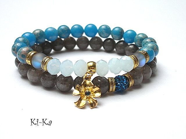 Komplet dwóch bransoletek wykonany z naturalnych kamieni - howlit [8mm], kwarc matowy mystic [8mm], fasetowanych kryształków [8 x 6mm], przywieszki z cyrkonią ,kuleczki shamballa [8mm] ,marmuru [8mm] oraz elementów w kolorze złota. Bransoletka na gumce silikonowej. Pasuje na nadgarstek 16-17cm. Biżuteria ozdobnie zapakowana. Możliwość dopasowania bransoletki do nadgarstka - wcześniej prosimy o kontakt.