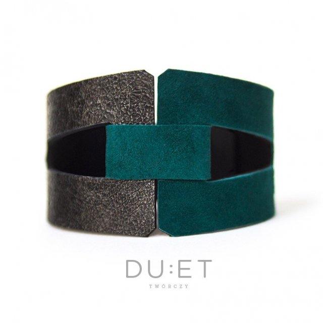 Ciekawa zestawienie kolorów i faktur. Bransoleta wykonana ze skór naturalnych: zamszowej w głębokim, turkusowym kolorze i grafitowej w stylu vintage z ciekawą fakturą i przetarciami. Podklejona miękką, czarną licową skórą naturalną. Zapinana na dwa knopiki kaletnicze w kolorze srebrnym. Od podstaw wykonana ręcznie. Wygodna, starannie wykrojona. Wzór autorski.