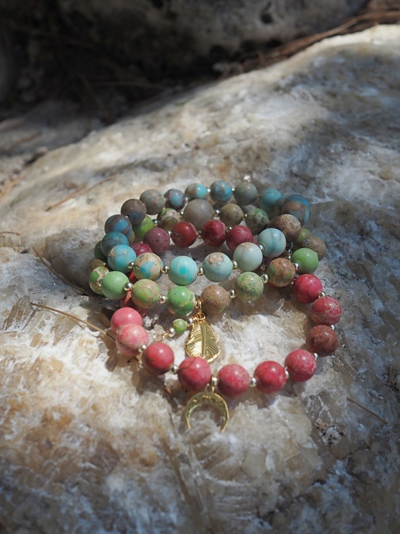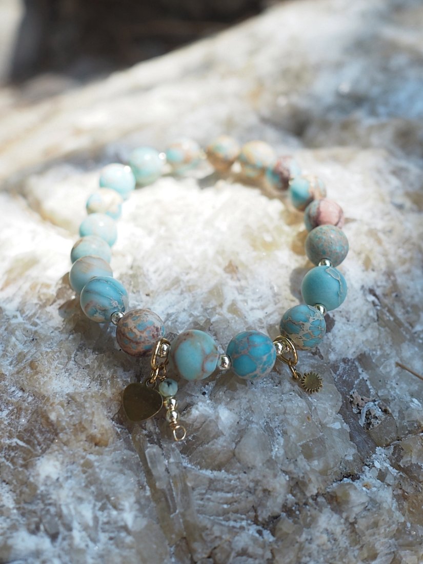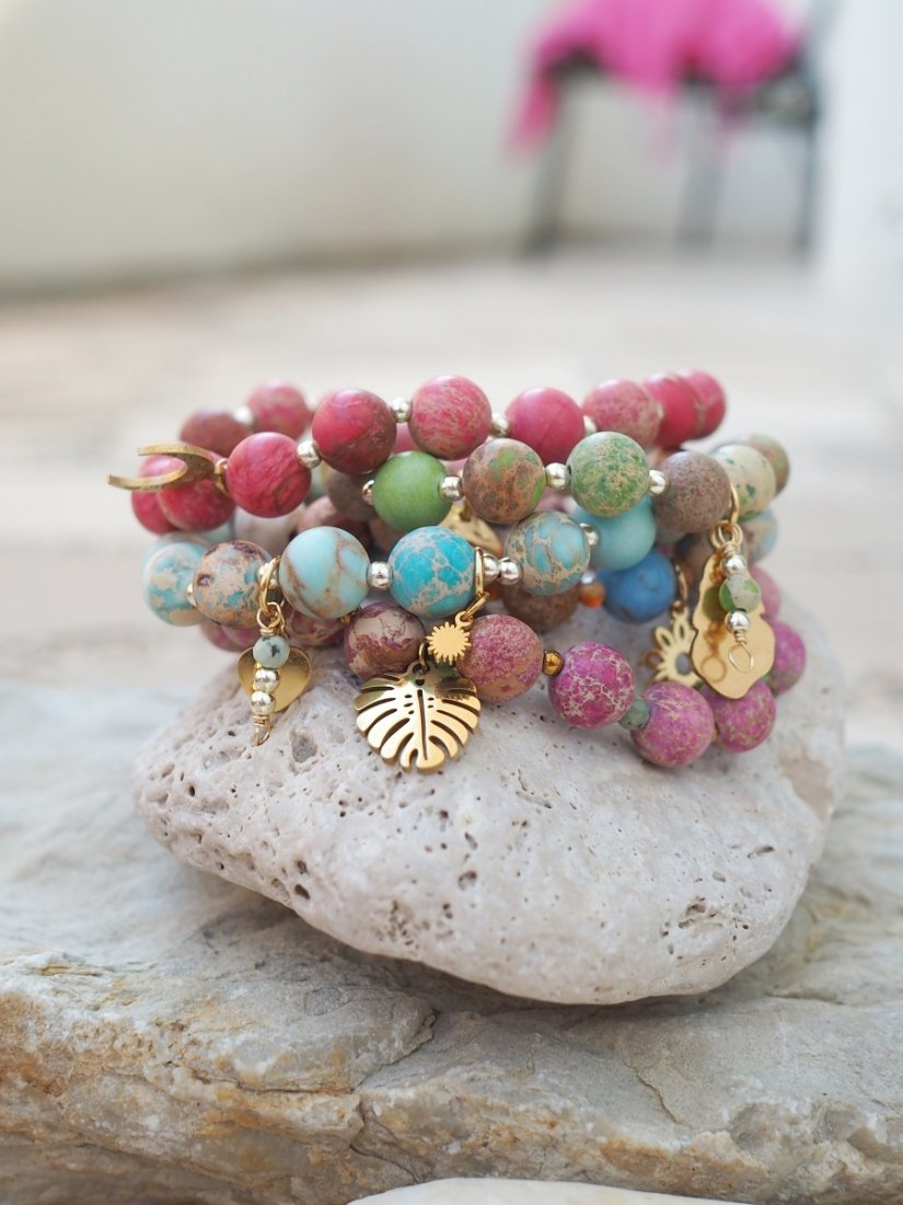 Ręcznie robione bransoletki z jaspisu cesarskiego marki DomilkowyDomek to wyjątkowa biżuteria stworzona z naturalnych kamieni. Każda bransoletka ma unikalny układ kolorów – od turkusu i różu po odcienie piasku i ziemi. To idealny dodatek w stylu boho i vintage dla kobiet ceniących niepowtarzalność i energię natury.