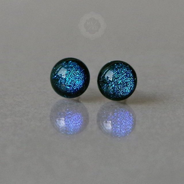 Szklane kolczyki- sztyfty wykonane, z niezwykłego,pięknie mieniącego się szkła, metodą fusingu. Kolor kolczyków zmienia się,zależnie od kąta patrzenia.
