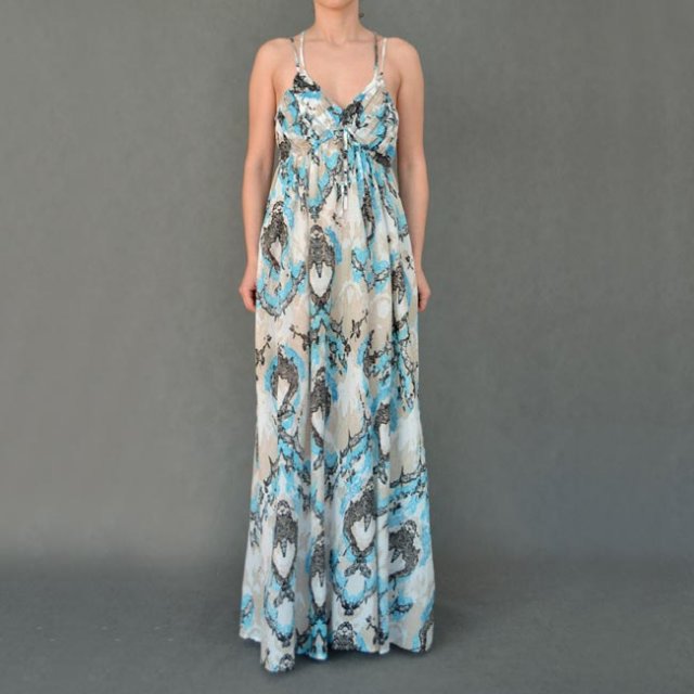 Sukienka maxi. Bardzo lekka i przewiewna. Ciekawie krzyżowane ramiączka. Kolory przywołujące wspomnienia z lazurowego wybrzeża... Polecam.