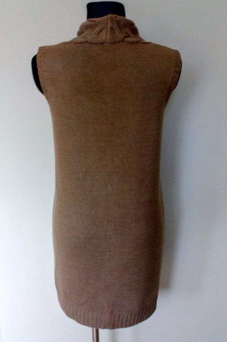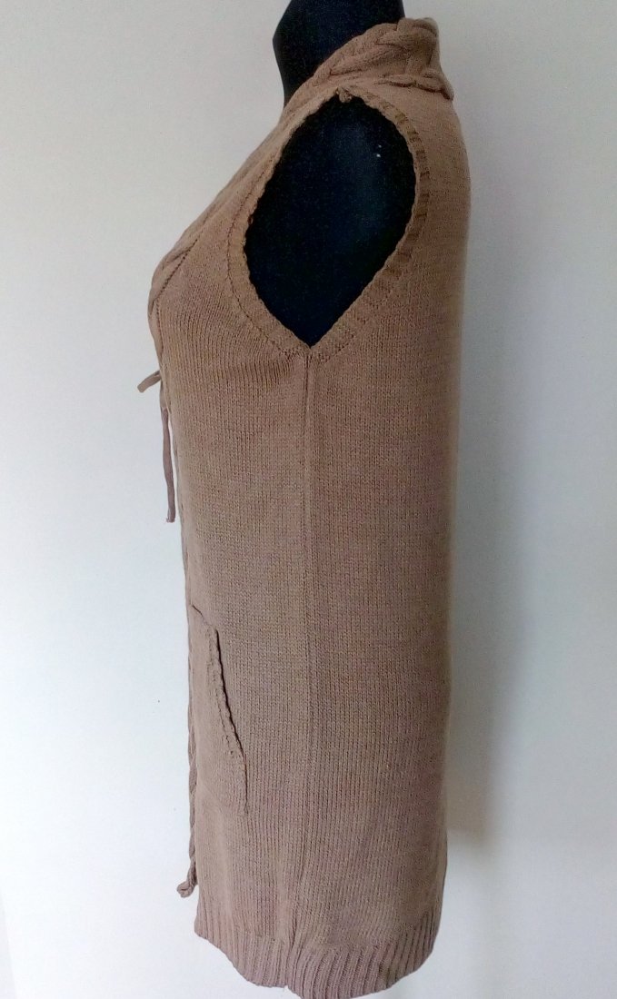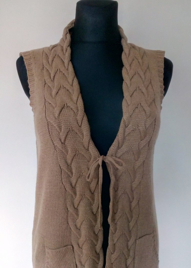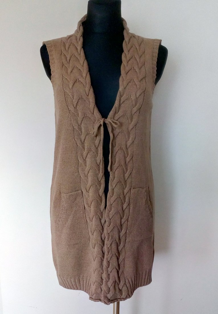 Długa kamizelka w camelowym kolorze, z wiązaniem trokami z przodu i naszywanymi kieszeniami
