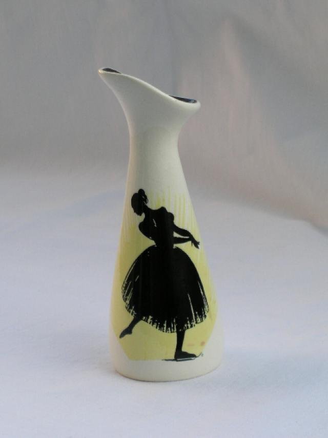 Urokliwy wazonik ceramiczny w ciekawej odsłonie - oryginał z lat 60-tych, angielski, sygnowany Wade, seria baletowa :) Podszkliwna graficzna malatura w nowoczesnej kolorystyce i błyszczące, kraklowane szkliwienie. Dół 4; wysokość 11,5 cm. Stan zachowania bardzo dobry.