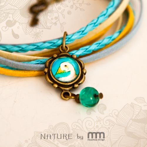 Bransoletka Łebędź, z możliwością noszenia jako naszyjnik, to bardzo romantyczne, nostalgiczne i kobiece malutkie dzieło sztuki. Obrazek pod szkiełkiem to autorska ilustracja. Bransoletka z kilku rzemieni prezentuje się wspaniale, a zawieszka oraz medalion dopełniają romantyczną stylistykę .