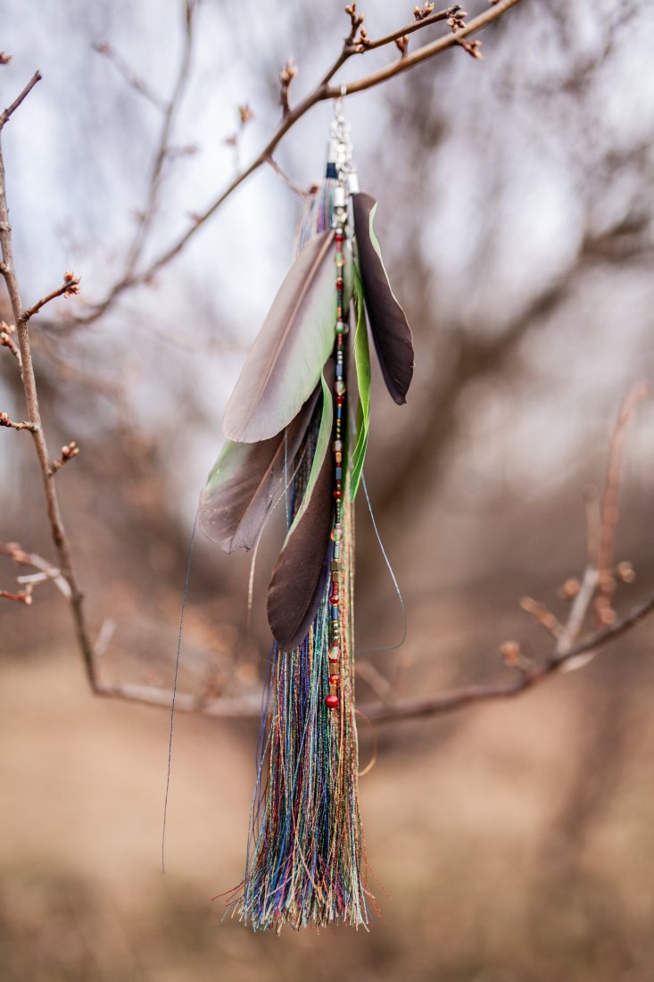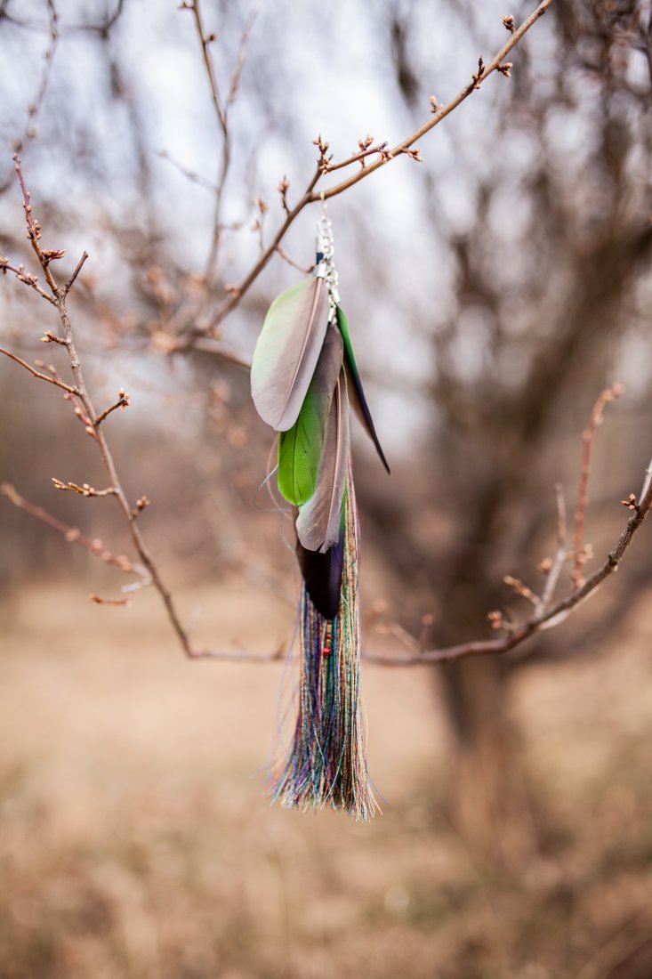 ten wyjątkowy pojedynczy kolczyk z pięcioma piórami papugi